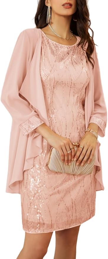 GRACE KARIN Sequin Dress for Women Knee Length Mother of the Bride Dresses Formal Dress Two Piece Dress with Chiffon Jacket