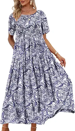 YESNO Women Casual Loose Bohemian Floral Dress with Pockets Short Sleeve Long Maxi Summer Beach Swing Dress EJF