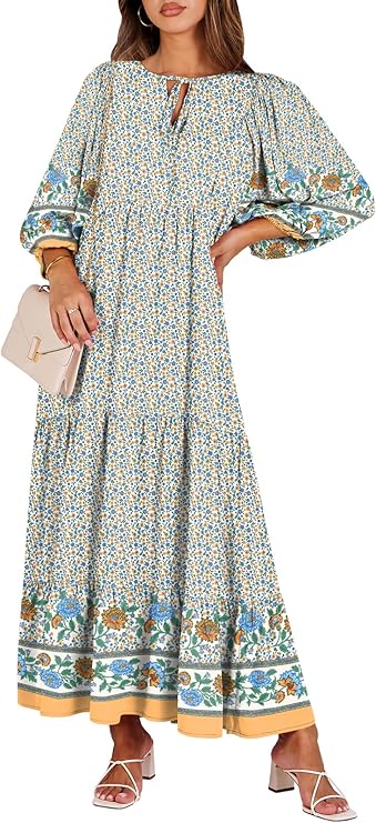 ANRABESS Womens Boho Maxi Dresses 2025 Summer V Neck Puff Sleeve Floral Flowy Swing Casual Long Dress