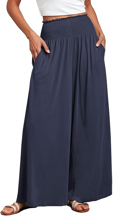 ANRABESS Women Palazzo Pants Summer Boho Bagyy Wide Leg High Smocked Waist Casual Loose Lounge Pant with Pocket