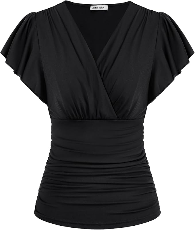 GRACE KARIN 2025 Womens Tops Summer Wrap Blouse V Neck Ruffle Sleeve Dressy Casual Top Ruched Trendy Clothes